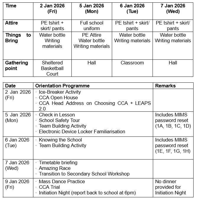 All Sec 1 students are to report to the Sheltered Basketball Court by 7.20am on 2 January 2026 (Friday). Our Unity Councillors will be at the school’s foyer to direct the Sec 1 students to the reporting venue.